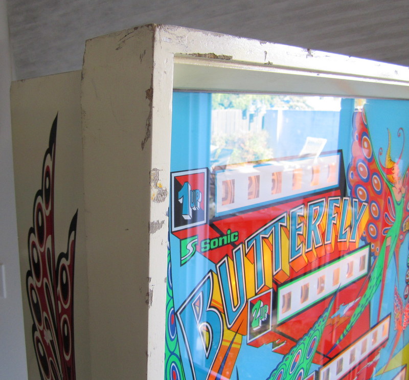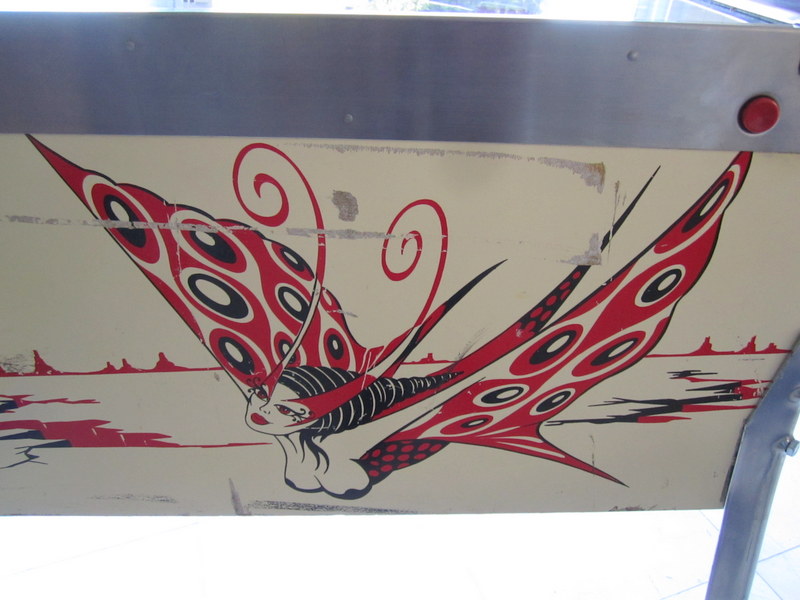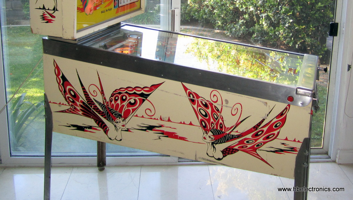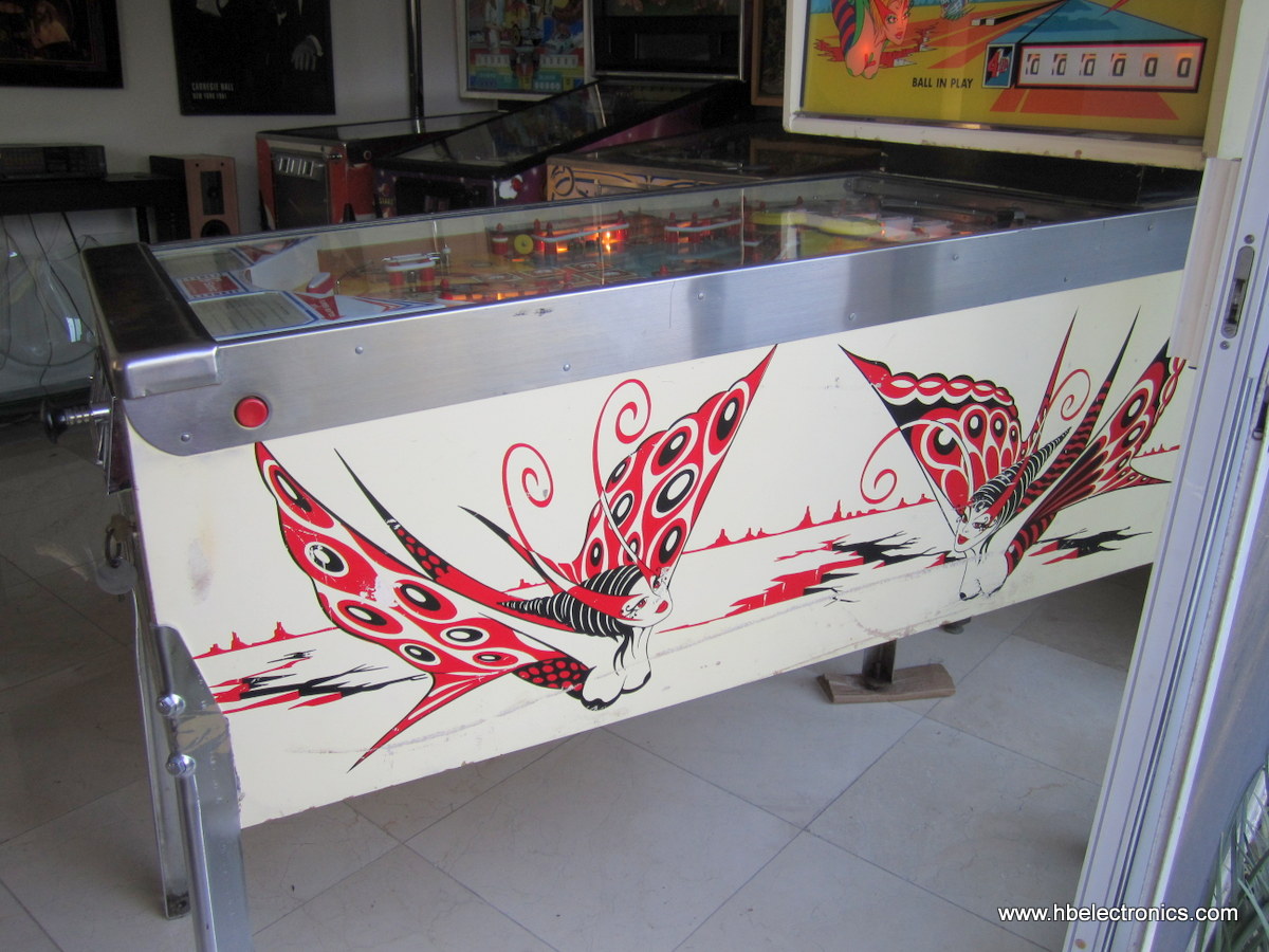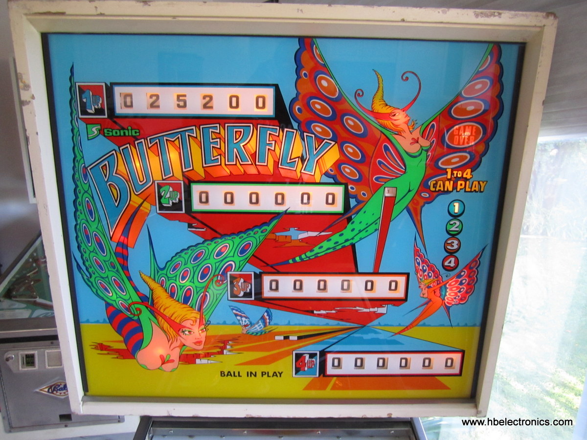 Here is a Sonic (aka Segasa) Butterfly pinball machine, made in Spain in 1977. The playfield on this machine is in remarkable condition. With only a few hairline cracks in the finish that are noticeable only on close-up, the playfield looks nearly new. Also the backglass appears flawless.